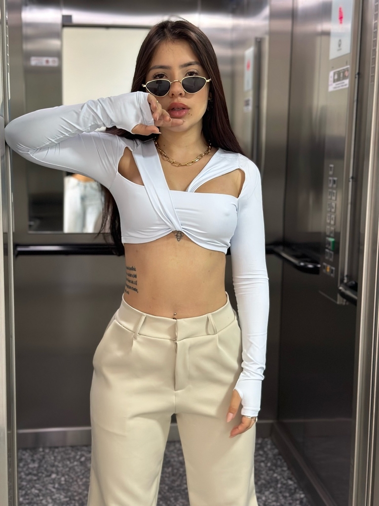 Modelagem pantalona com cós largo com feixo frontal, dois bolsos frontais. Fechamento da peça por zíper e feixo. Elástico atrás.
