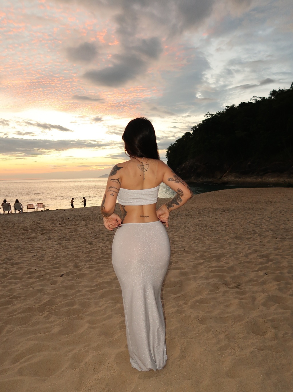 Vestido longo, com recorte no decote, com amarração livre, podendo amarrar no pescoço ou tomara que caia. O tecido é duplo na parte do busto. O tecido é lurex, SUPER BRILHANTE, a melhor opção pra você que quer BRILHAR!