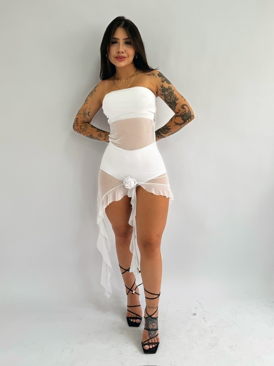 Vestido com fenda e calda lateral, tomara que caia e todinho de tule, sensual e estiloso! o top cobrindo o peito já é costurado, e acompanha hotpant! O tecido é super confortável e leve!
