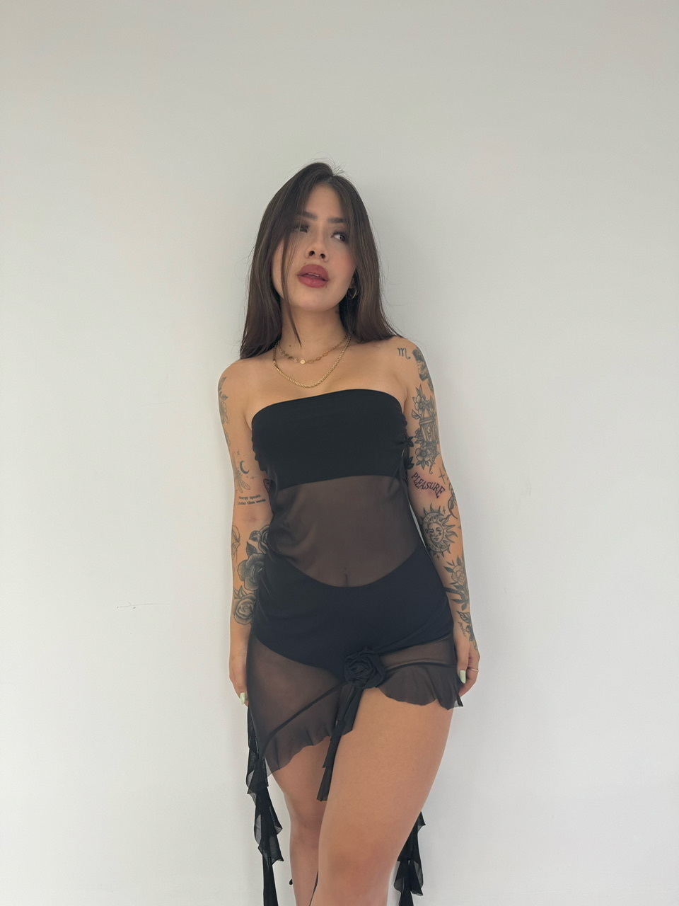Vestido com fenda e calda lateral, tomara que caia e todinho de tule, sensual e estiloso! o top cobrindo o peito já é costurado, e acompanha hotpant! O tecido é super confortável e leve!