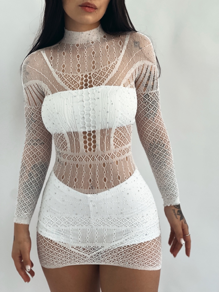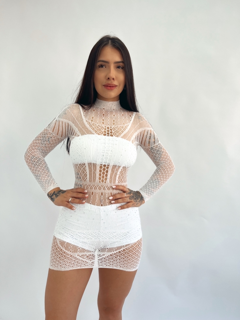 Vestido tubinho em tecido de arrastão com bastante elastano, cheio de strass! Aquele vestido que para tudo por onde você passa.
